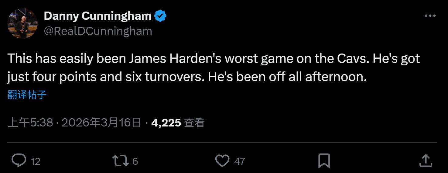正如赛后骑士跟队记者Danny Cunningham所说:“这无疑是哈登加盟骑士以来最差的一场比赛,整场比赛他的状态都十分低迷。”